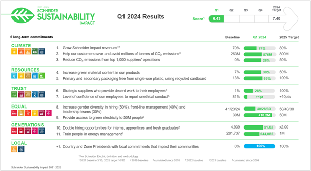 La puntuación del SSI de Schneider Electric en el primer trimestre de 2024 alcanza 6,43 sobre 10 (avanza hacia el objetivo de 7,40 sobre 10 para final de año). Este comienzo de año prometedor coincide con el lanzamiento de la renovada propuesta de valor para los empleados de Schneider Electric, «IMPACT starts with us», y el despliegue de nuevas soluciones para la eficiencia energética, la automatización y la descarbonización en su emblemática Cumbre de la Innovación de París.